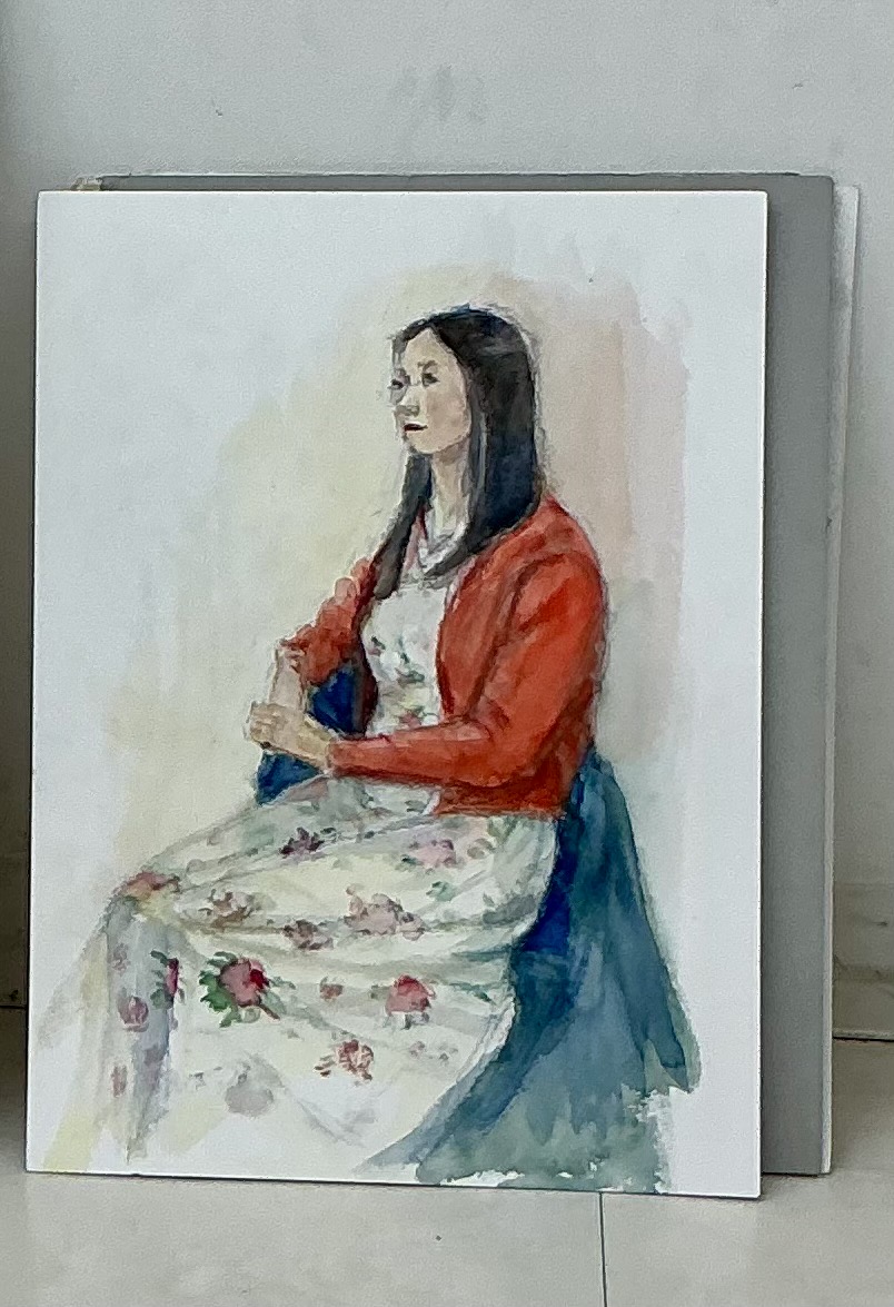 | 足の具合を考え、荷物を最小限にして臨んだこもれびの人物画会。F4の小サイズ用紙が幸いしたのか、自分ではかってないスピード感で描き進め、現場「完成」画になったことを喜んだ。しかし、帰宅するとついつい写真と見比べてしまう。写真と違うところは描き方がヘンかなと思って筆を執ってしまう。現場での筆致や空気感を壊すと分かっているのに加筆修正するとは、喫煙や飲酒と同じ。いや、たまに成功することがあるので、パチンコ依存症に似ている。多くの失敗体験をしているのに止められない依存症だ。今回も結局、現場の絵を台無しにしてしまった。この絵は、改めて白紙から描き直したもの。現場特有の潔い筆致は再現できないが、現場で受けた感覚は脳裏に残っている。それを頼りにモデルさんから受けた抒情的な印象を、写真を観ながら追っていった。赤いカーディガンに華やかな花柄のワンピース。春を連れて来てくれたモデルさんの印象が少しでも伝わればありがたい。 (参考)現場「完成」画は下方にアップ。↓ |