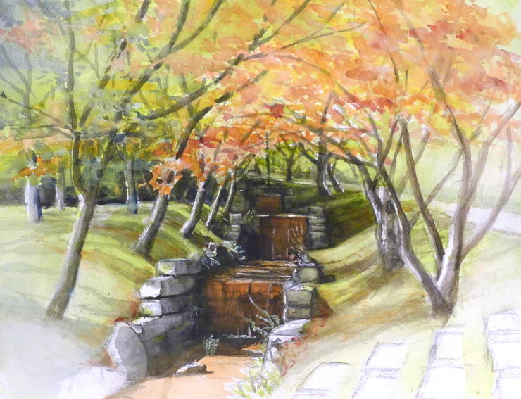 18日ぶりの更新になってしまった。どうもこのところ思うように描けないという意識が強くなり、描いても途中で放棄してしまうことが多い。新年を迎えても新作が無く更新できなくなっていた。ようやく意を決して昨年11月にクラブのスケッチ会に参加して鉛筆スケッチ状態で終えたものに彩色したものがこれ。スランプ?を早く脱して今年こそ少しはましな絵が描けるようになりたいものだ。
