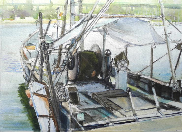 この老朽化した木造漁船に惹かれ、スケッチ会の下見の時や堺での用事の序でに立ち寄ってはスケッチしてきたのに、本番のスケッチ会では、どうもデッサンがおかくなって最後まで描き進められなかった。これはその描き直し画。失敗作も入れると5枚目になる。