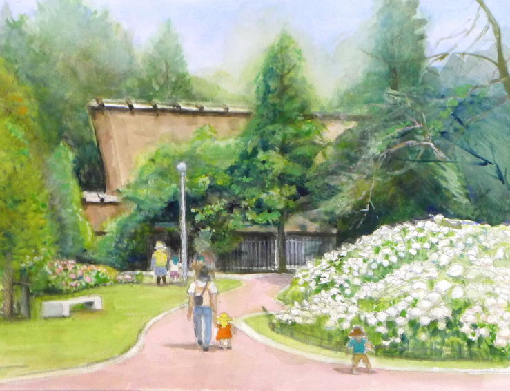 | こもれび水彩クラブのスケッチ会で服部緑地のあじさい園(2020年3月完成)を訪れた。オープンしてまだ4年目、規模は大きくないがどの株も生育盛んなためか花に勢いがあるように感じた。とりわけ、二つの大花壇に密集して植えられているアナベルが満開で、白く大きな花で埋め尽くされている様は圧巻だった。柵越しに民家集落博物館の建物を臨める広場でのんびりと憩う親子、駆け回る幼児などを眺めていると、こちらものんびりして心が休まってくる。そんな情景を絵に表現したかったのだが、またこんな濃厚タッチの絵になってしまった。 |