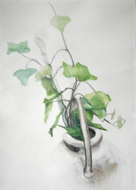川端画塾で古びた如雨露にヘデラ(アイビー)が活けられていた。夏の季節感溢れるモチーフなのに出来はもうひとつだった。もう一枚異なる角度から描いてみた(最初の絵)がまだこんな程度。