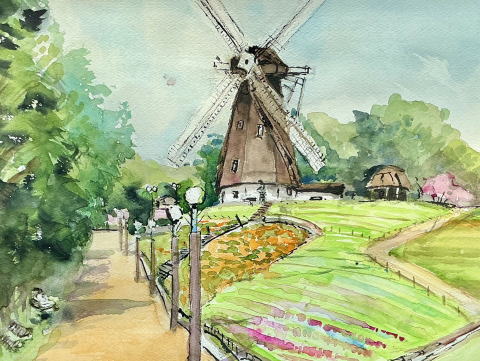 | 残暑厳しい中、こもれび水彩クラブのスケッチ会に参加。この巨大な風車は1990年に鶴見緑地で花博が開かれたときに建てられたもの。緑地内の「鶴見新山」(標高39m)の頂上付近にあり、緩やかな斜面は大花壇になっている。晩夏の今は咲いている花は多くなかったが、11月には一面コスモスが咲き誇り大勢の人出で賑わう所だ。ところで、かってこの辺りはゴミ(都市廃棄物)や地下鉄工事の残土などで固められた山であったことをご存知だろうか。山は70年代から造成されていて花博の頃になると近畿自動車道から一部が見えるくらいに高くなっていたことが記憶に残っている。鶴見新山と名つけられたゴミの山が1990年に花博の舞台へと生まれ変わり、その跡地が再整備されて「花博記念鶴見緑地公園」に進化を遂げたのだ。今や市民の憩いの場として、市民文化を育む地として親しまれている。何と素晴らしいことではないか。この風車、そう思うと戦後の経済成長と都市開発で生じた影の部分に光を当てた象徴のような存在として誇らしく立っているような気がしてくる。それから35年後の現在、関西万博が同じような都市廃棄物で埋め立てられた夢洲で開催中である。地盤の軟弱性、メタンガスの発生、交通アクセスの脆弱さなど大問題が残されたままの開幕となった。閉幕後は会場隣接地がIR(統合型リゾート)へと転換されることになっている。兆が付く莫大なお金をかけてのIRが果たして市民の日常的な憩いの場に生まれ変われるだろうか。カジノを中核とした商業と観光施設なんて結局享楽と消費の場になるだけだろう。健全な市民的文化が育まれる地にはなりえないと思う。そんなモヤモヤしたことを頭に浮かべながらスケッチしていると熱射が差し込み眩暈がしてきた。(下の絵は現地で描いたスケッチ画。上の絵は帰宅後、構図を変えて描き直したもの。風車から羽の音が聞こえるような丘をイメージしたのだが・・もうひとつだった。) |