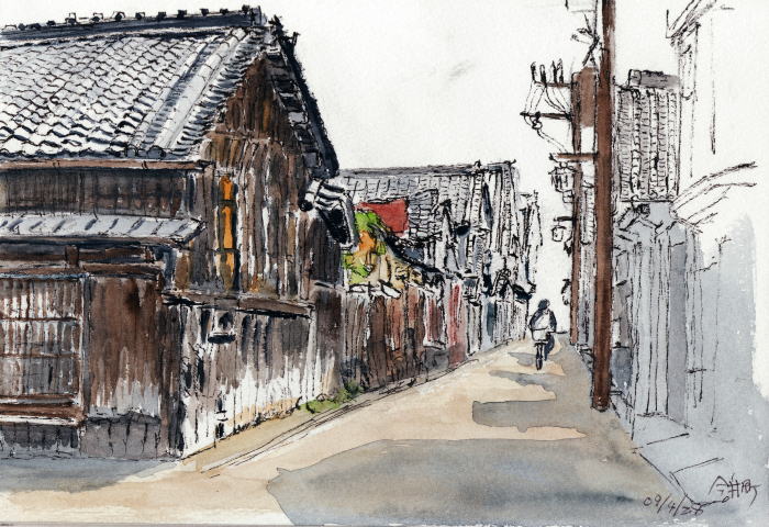 GWが始まる前に奈良県橿原市の今井町を初めて訪れた。噂には聞いていたが、こんなに絵になるところとは想像していなかった。いっぺんに気に入ってしまった。早くから住民たちの景観保全運動が行われてきたところなので、歴史的建造物がよく保全され、古い民家の町並みがなんとも良い情緒を醸し出している。崩れかけた民家もまだ多く残っていて、私には修復されたところより絵心がそそられる。スケッチの準備をしていると雨が降り出したので、SMサイズの小さな画帳にスケッチして淡彩風に着色した。