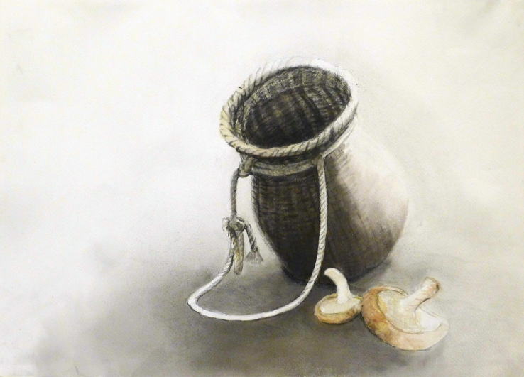 5月度の川端画塾での習作。竹製の魚籠(びく)にキノコと山菜が数種並べられていた。これらを自由に組み合わせて絵作りするわけだが、構図つくりは苦手でいつも迷ってしまう。結局、魚籠を山菜取りの収穫籠に見立てた構図にしてみたのがこれ。どうも素材の質感が十分出し切れてないのが残念。(6/23 キノコを加筆修正)