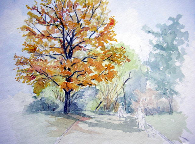 千里中央公園の風景ばかり続き申し訳ない。紅葉はあらかた散ってしまい、まだ黄葉を付けたままの木がくっきりと目立つ存在になっていた。いつもの私の「画風」(まだ確立していない。「傾向」という程度です。)ではなく、免田さんを見習ってたっぷりと筆に水を含ませて描いてみた。