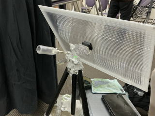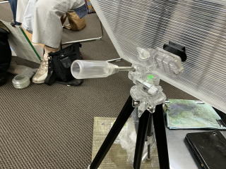 ↑そのためにがっしりと三脚に固定できます。 ↑イーゼルを立てて使うときはこのように電池式ミニ扇風機を取り付けられます。