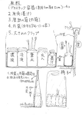 | ● クロッキー用墨汁セット 今回はイーゼルの紹介ではありませんが、パイプ椅子をイーゼル代わりにしてクロッキーを描くときに便利な用具を紹介しましょう。 高槻人物画同好会の青木さんのクロッキーは、葦ペンで墨汁の真っ黒な線を描かれます。太くも細くも自由自在、おまけに力強い線でとても魅力的です。Aさんは、その上に筆で墨汁のモノクロの微妙な濃淡まで入れられます。長くても10分程度しかないクロッキーで濃淡を付けるとは神業かと思いますが、それなりに工夫された用具セットを準備されているのです。 作り方:(青木さんから手書きの作り方をいただきました。これを見られたほうがよく分かります。下方に追加しています。9/3) @小瓶を5つ用意します。一つは筆入れ、後の4つには水、墨汁の原液、濃淡が異なる薄めた墨汁液を入れられてます。 Aビニールの買い物袋を切って二つ折りにします。 Bビニールの上にもう一枚ビニールを被せてガムテープで固定して丈夫なものにします。端もガムテープで補強します。長さは椅子の汚れ防止のために座面よりも長くします。(写真参照) C写真のように持ち運べるようにします。持ち手はクリップです。使用時は背もたれへの固定用です。二つ折りの中程に厚紙で作った箱をガムテープで固定します。箱は5つの小瓶がぴったり入るサイズで作ります。(写真参照) これで目の前のモデルさんから目を離さず、必要な濃度の墨汁を使い分けてすばやく描くことが出来ます。 運搬に便利なので、屋外スケッチで風景画を墨汁で描くときにも応用できると思います。 |