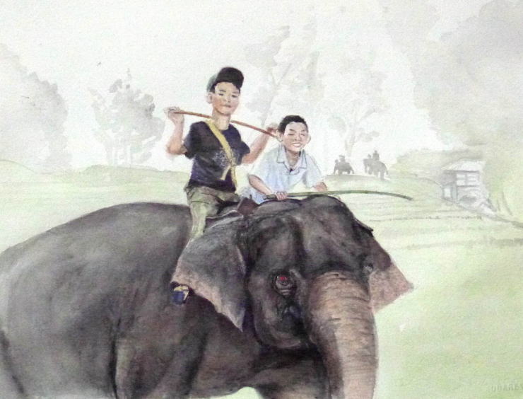 メーコック川の辺にあるカレン族のルアミット村を訪れたときの風景画は先にアップしたが、もう一つタイらしい雰囲気が伝わらなかったようだ。それでもう一枚描いてみた。ルアミット村にはゾウが50頭も飼われていて観光客を乗せて村内を回っている。この少年たちは、そのお手伝いをするために飼い主の家から出てきたところ。得意顔で嬉しそうな様子が微笑ましかった。